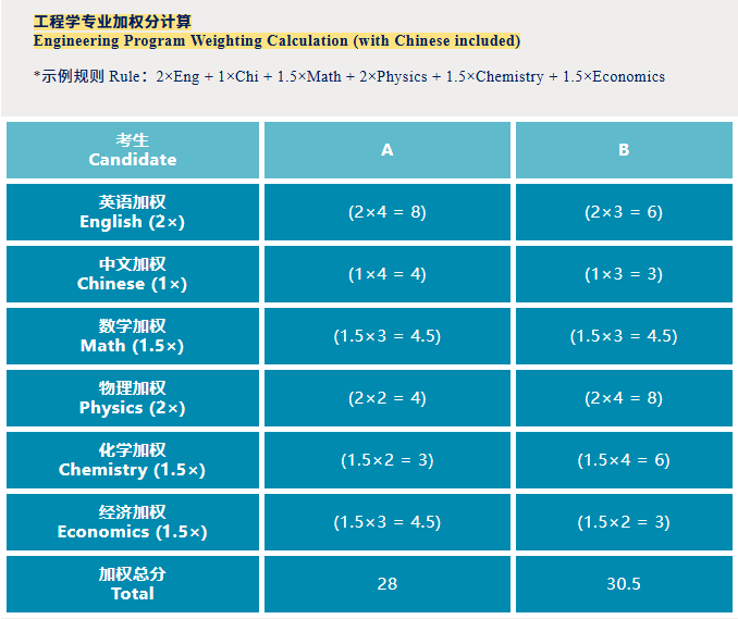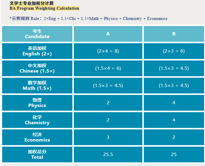 For example, a candidate with English 5 and Chinese 4 can obtain 16 points in language weighting for a BA programme via 2×5 + 1.5×4, while a candidate with Math 5 and Physics 5 can achieve 15 points in scientific weighting for an engineering programme via 1.5×5 + 1.5×5—both gaining a competitive edge in their target programmes.