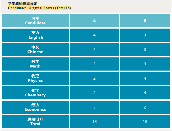 Although the two candidates have the same total original score and subjects, their individual subject performances lead to different weighted scores for different programmes: Candidate A has a slight edge in BA programmes, while Candidate B demonstrates a significant advantage in engineering programmes.