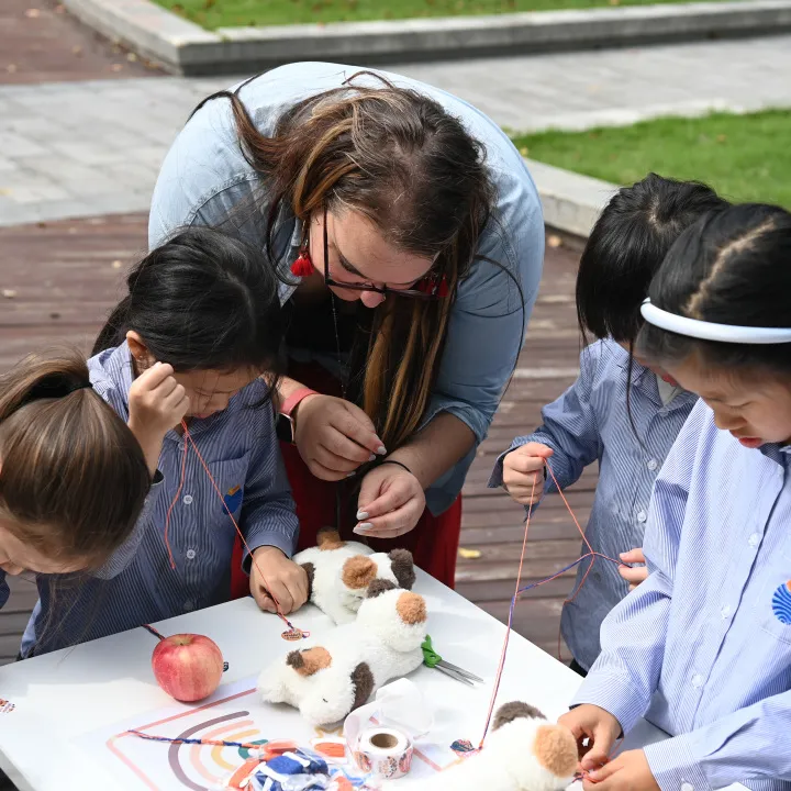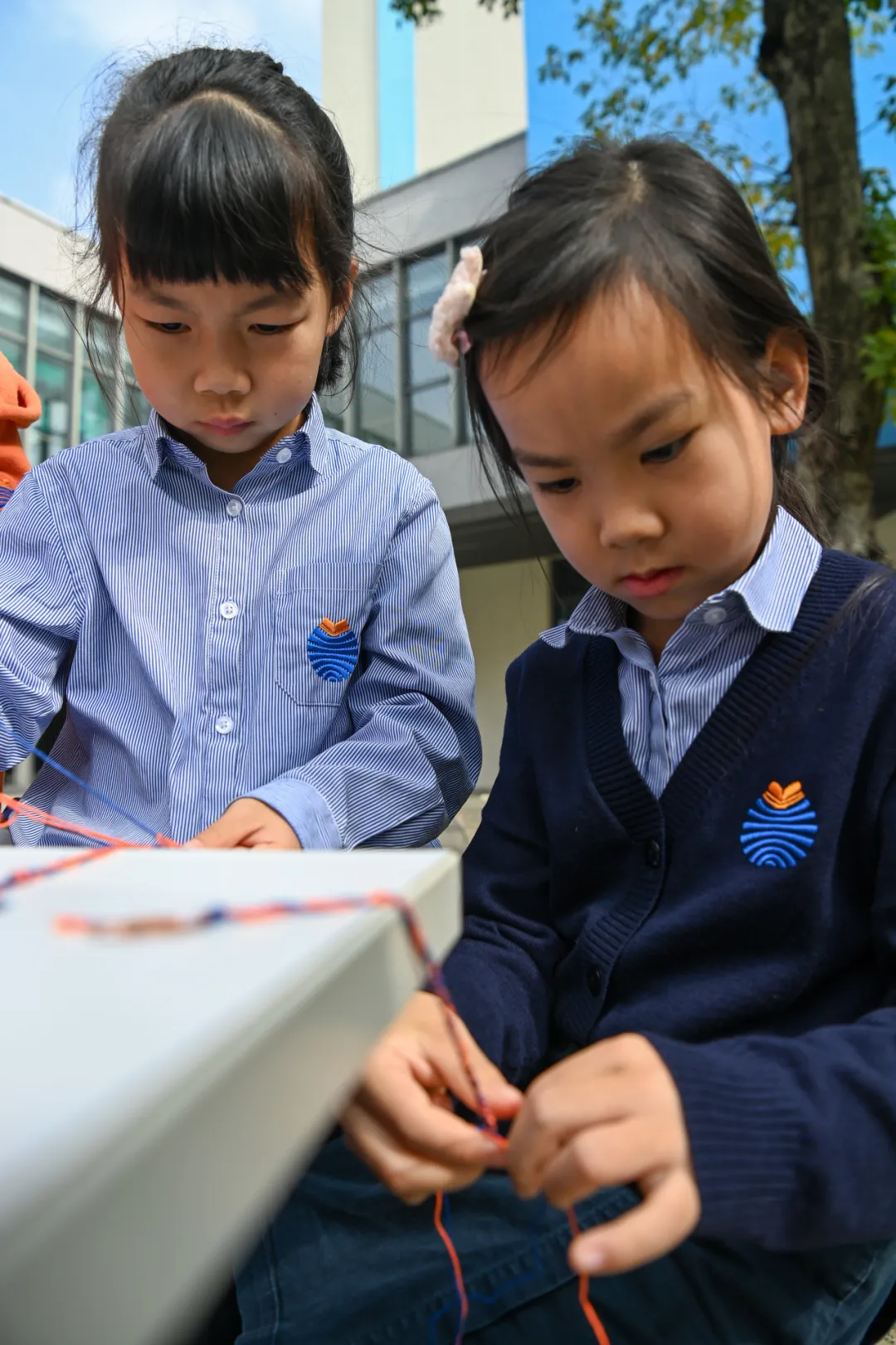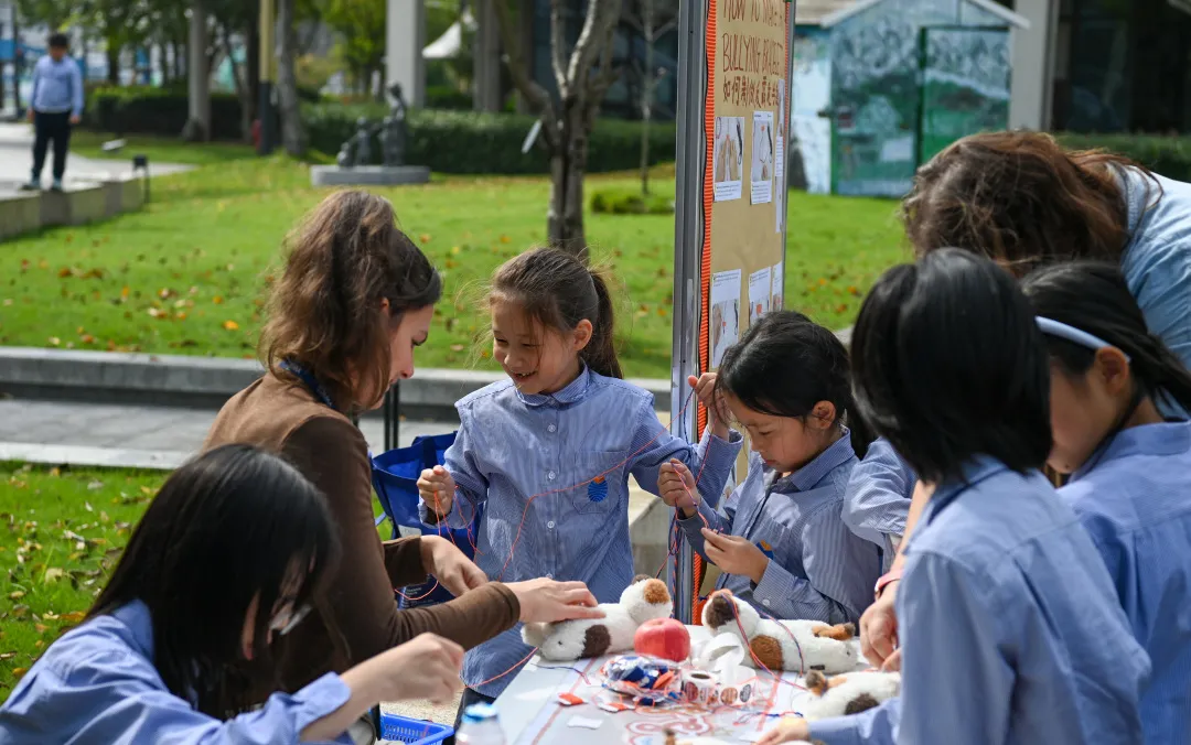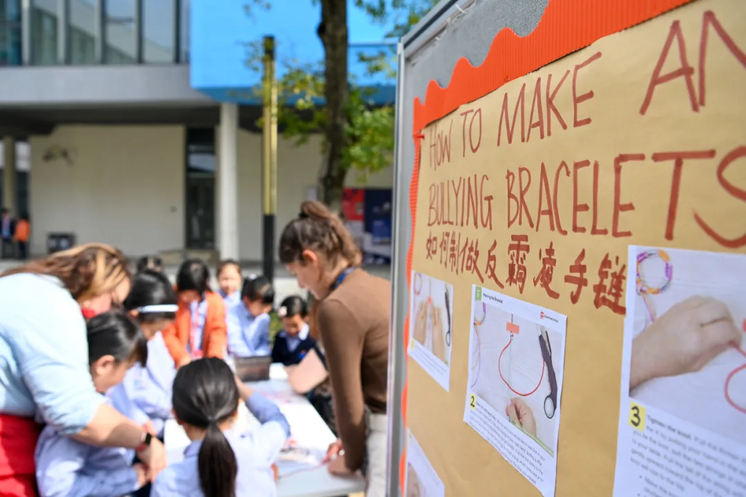 学生和老师们亲手制作独具意义的橙色与蓝色主题“反欺凌”手链。