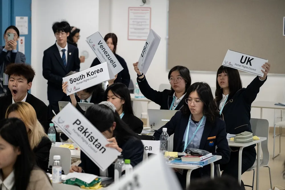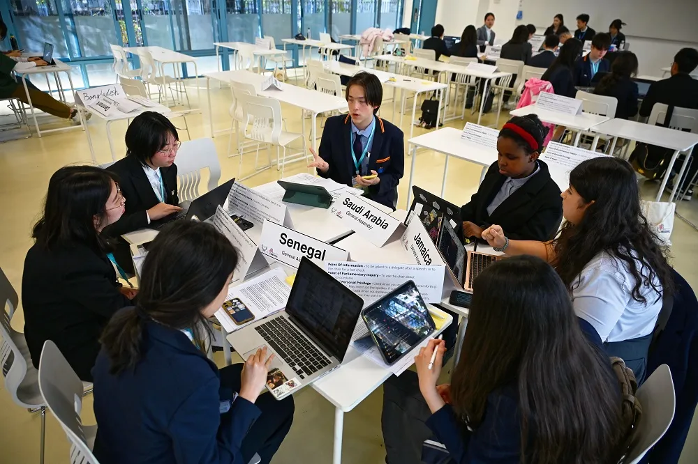 本次大会,我校中学部学生Ethan WHITEOAK、Sonya ATIF、Emma DE IULIS、Luciana DIANGA及Sky YANG 分别代表挪威、尼日利亚、南非、沙特阿拉伯和印度尼西亚,置身于人权理事会与联合国大会两大核心会场。